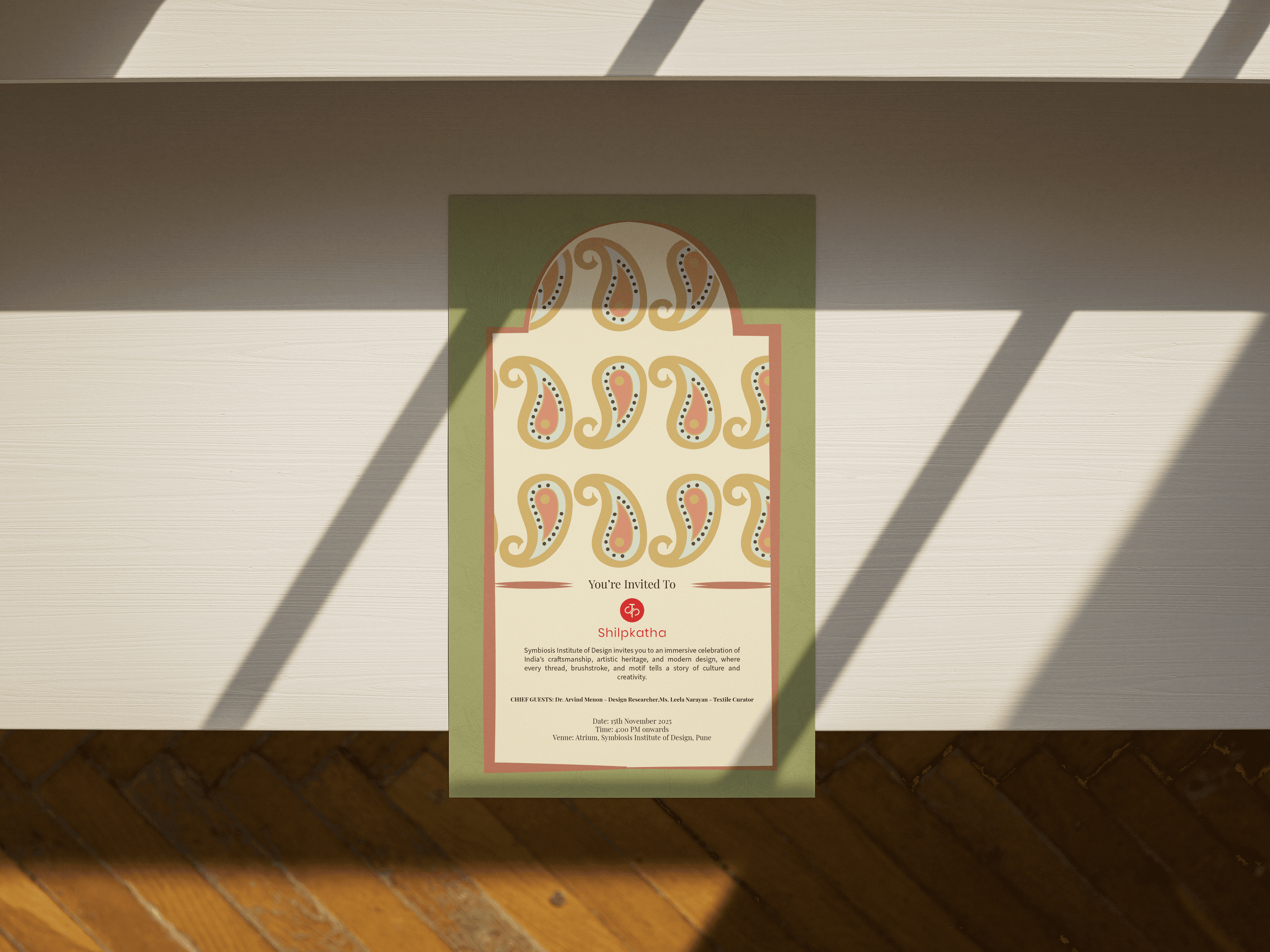Bauhaus energy, Indian classroom.A Bauhaus-inspired product poster for PIVOT, using primary colors and bold illustration to give a drafting chair the visual weight it deserves.Speed, dressed in black and orange.A concept social graphic revealing McLaren's 2026 livery direction, built around high contrast and typographic impact.Shilpkatha Invite (Paisley)An invitation that looks like the event itself.Event collateral for Shilpkatha, a craft and design celebration at SID Pune. The paisley motifs and arch form carry the cultural theme before the reader even reads a word.Shilpkatha Invite (Peacock)Heritage, held in your hands.The companion invite card for Shilpkatha, using a hand-illustrated peacock and earthy tones to set the tone for an evening of Indian craft and artistry.